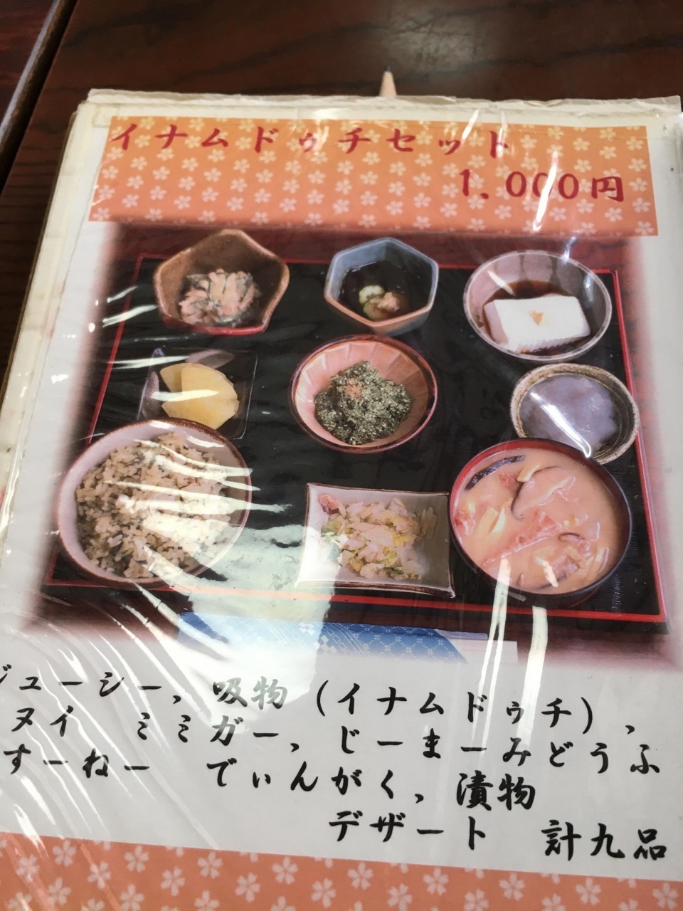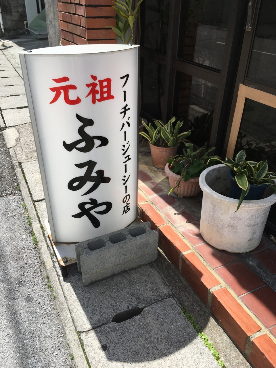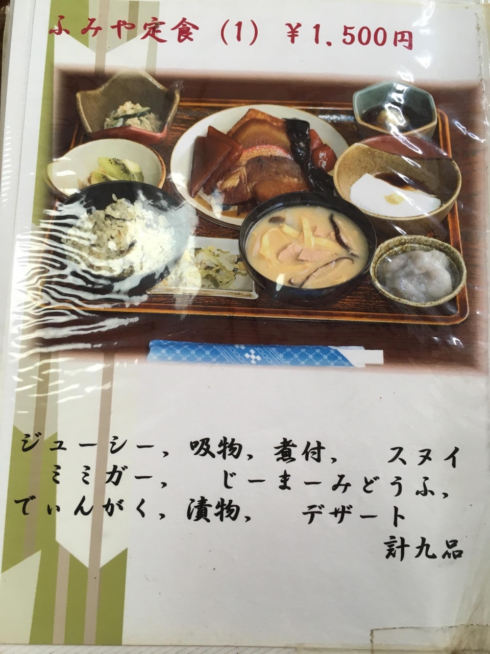以前から行ってみたかった元祖フーチバージューシーのお店です。フーチバーとは「よもぎ」の事です。場所は住宅街で分かりにくいかもしれませんが、前島の交差点を曲がって少し行ったところで、お店の裏には車が数台停められる駐車場もありました。「とまりん」からも歩いて行ける距離だと思います。ふみや定食をいただきましたが、品数も多くそれぞれの料理がとても美味しくて大満足でした。那覇に行ったらまた行きたいお店です。