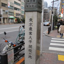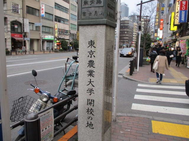 JR飯田橋駅から目白通りを九段下方向へ少し行った目白通り沿いラーメン屋前の歩道にある東京農業大学開校の地の標柱に歩いて2分ぐらいで着きます。標柱の説明文によれば明治24年東京農大の原点「育英黌農業科」がこの地に産声を上げ、生みの親は榎本武揚で明治26年甲武鉄道の新設工事のため大塚窪町に移転しました。と記してます。この近くにはラーメン屋の行列があり、ゆっくり説明文を読むことができませんでしたが明治時代はこの辺りが結構な田舎で農業と繋がりがあったという面影は全く感じられません。標柱のみで当時を偲ぶものはありませんが明治初期のこの辺りは学校設立や牧場、工業もあり開発地で歴史を学べますので歴史プロムナードを散策の際にお立ち寄りをお勧めします。