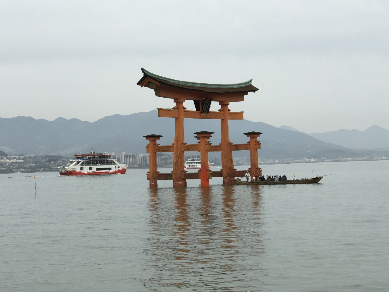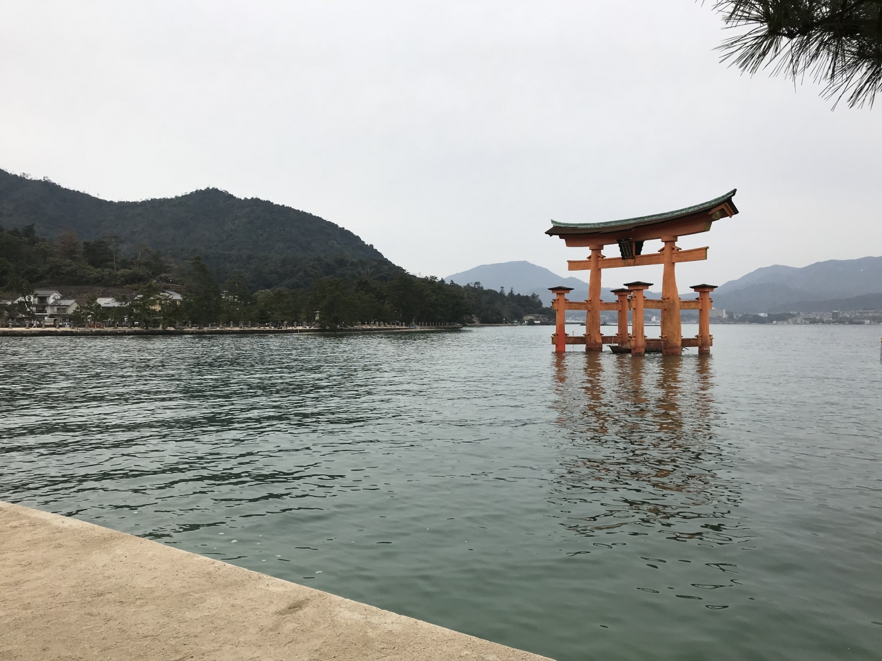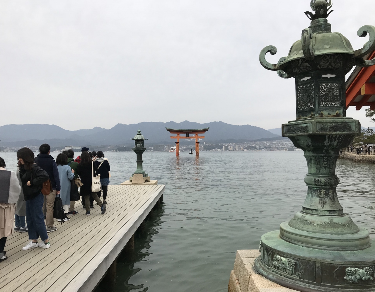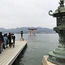 大鳥居を真正面から望めるスポットは、厳島神社内の火焼前ですが、こちらが一番人気で行列が出来ていました。