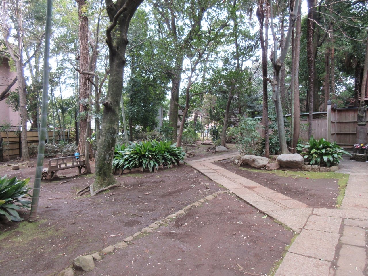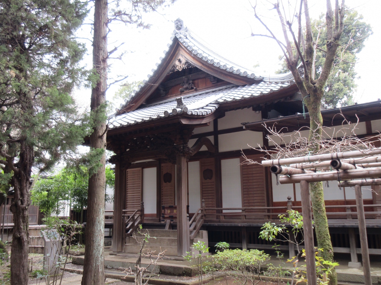 洗足駅から徒歩4分の日蓮宗寺院です。日本橋に創建され、その後移転をして1927年にこの地にあった御松庵と合併して移りました。洗足池図書館の隣にあり、山門と竹林が静かな境内への入口です。木造で障子戸の本堂は登録有形文化財です。自然木を使った梁や木彫りは古く味があります。境内に日蓮上人の像や子育観音像、浄行大菩薩があります。特に見ていただきたいのは祠が建つ日蓮上人袈裟掛けの松です。訪れた休日は寺立保育園は休みでした。洗足池公園を散策する際、落ち着いた妙福寺を訪れて日蓮の足跡をたどるのも面白いです。