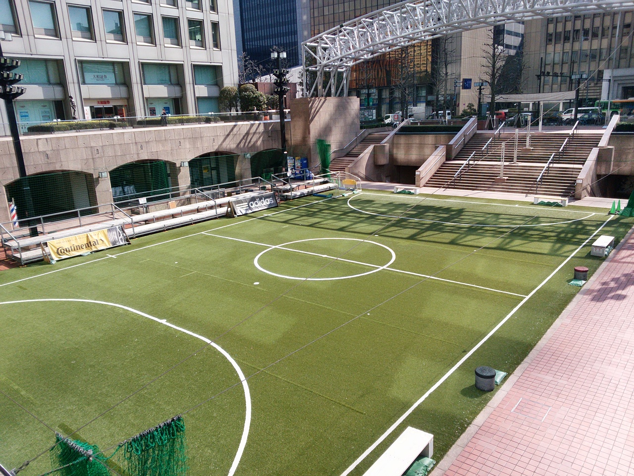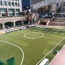 日比谷シティの日比谷国際ビルと富国生命ビルの間にある広場です。比較的広い広場で、フットサルのコートになっています。広場のまわりにはカフェ、ファストフードなどもあるので、天気の良い日ならコーヒーを買ってフットサルの練習や試合を観ているのもオススメです。