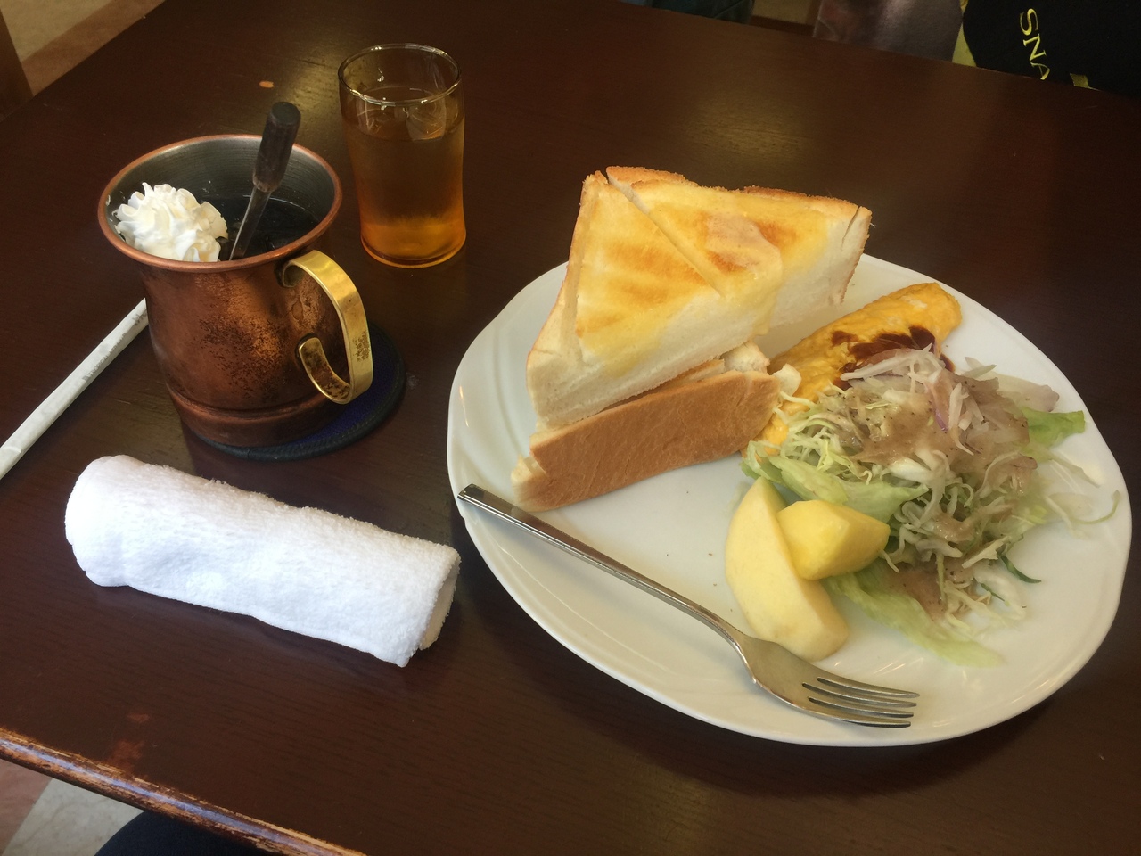 モーニングセット600円は厚切りトーストにサラダ、オムレツ、フルーツ、飲み物です。アイスコーヒーが美味しいですね!