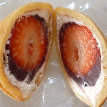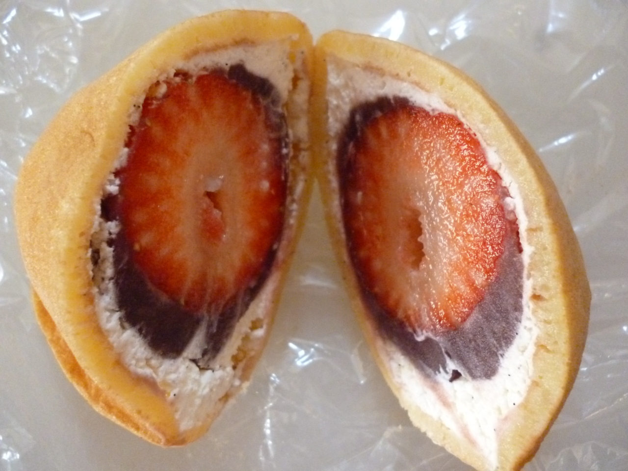 博多旅行で、大きなあまおうが1個丸ごと入ったたどら焼きを絶対に買おうと思って楽しみにしていました。ずっしりと重かったです。半分に切ると、中は生クリームの白といちごの赤がきれいな色あいでした。いちごが新鮮でおいしかったです。