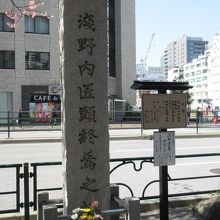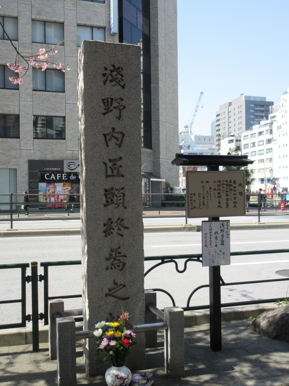 日比谷通り沿い、新橋4丁目交差点そばの歩道に3mほどの碑が建っています。かつて舊・田村屋敷があり、そこで浅野内匠頭が自害したとのことです。亡くなって240年を記念して建てられた碑です。たまたま訪れた日が3月14日の命日だったためか、碑の前には生花が手向けられ、日本酒やお菓子も置かれていました。日頃と違うようすだったのか、街ゆく人も足を止め碑を眺めていました。