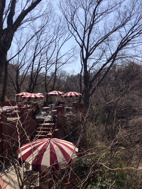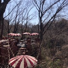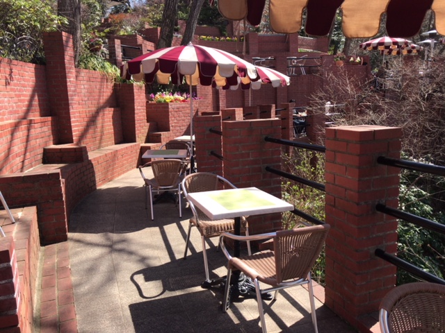 赤と白のパラソルがはためき、レンガ造りのテラスが可愛らしい雰囲気です。