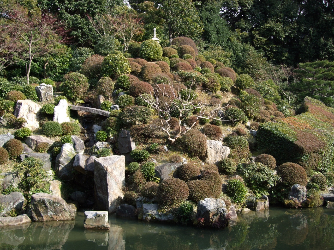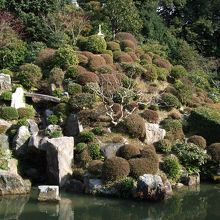 池、築山の石組みもむしろその多さに目が行きますが、刈込が意外なポイント。直線的な刈込は小堀遠州が得意としたもので、その影響も感じますが、いかがでしょうか。