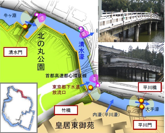 この地に、枡形櫓門と番所が構築され、平川橋が架けられ、竹橋から侵入する敵を撃退する狙いがありました。