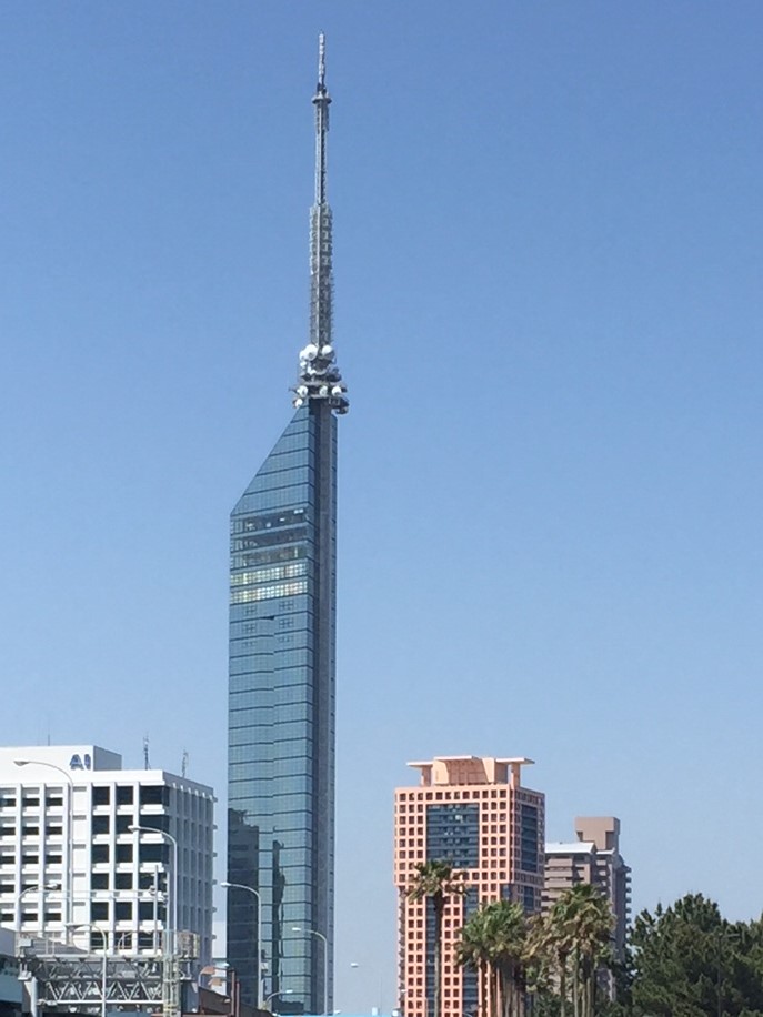 福岡タワーは福岡県福岡市早良区百道浜2丁目にありました。海のそばに高くそびえ立ってます。
