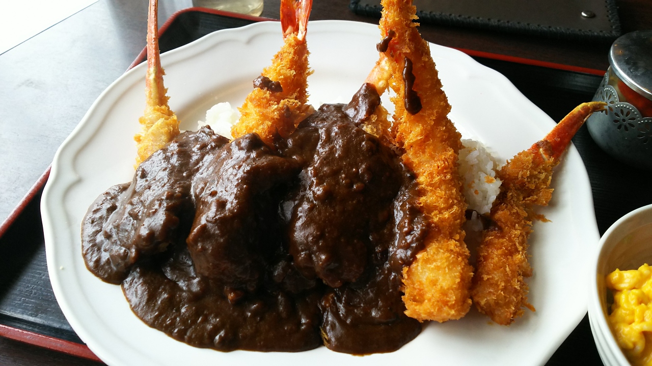 簡単に言ってしまえば、その名の通り、海老フライと蟹の足のフライが載ったカレーですが、その海老フライ(2本)、蟹の足のフライ(3本)、共に、衣が薄い、ガチンコのフライ、そのフライが5本も載ったカレーなので、十分に食べ応えがあります。