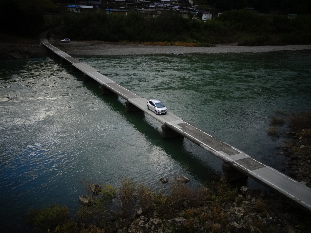 四万十川沿いをドライブ中、沈下橋を見つけたので立ち寄ることにしました。車1台分のスペースを渡るのはドキドキです。地元の方の生活道路となっているようで、時折地元の方と思われる車が渡って行きました。岸に上がると全景が見えます。