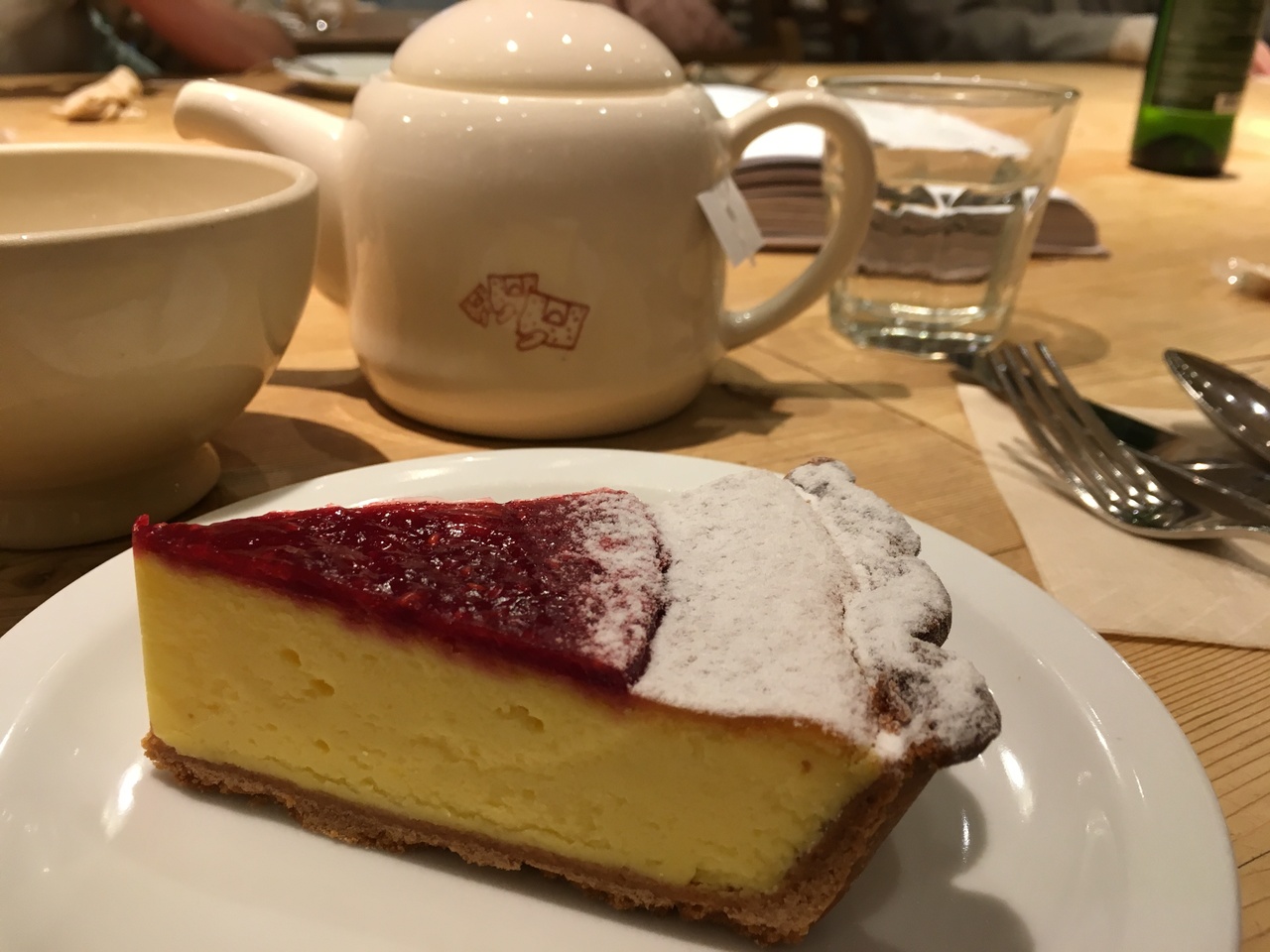 あ?れ?ニューヨークチーズケーキを注文したはずだが?と戸惑ったが、ケーキの断面をみるとニューヨークチーズケーキ(あるいはベイクドチーズケーキ)と呼ばれるやつのようで希望には沿っていたので、ケーキの名称は気にしないことにした。実際食べてみると、どっしり濃厚。そこにラズベリーのほのかな酸味が加わって、重たいけどさっぱりな風味に仕上がっている。