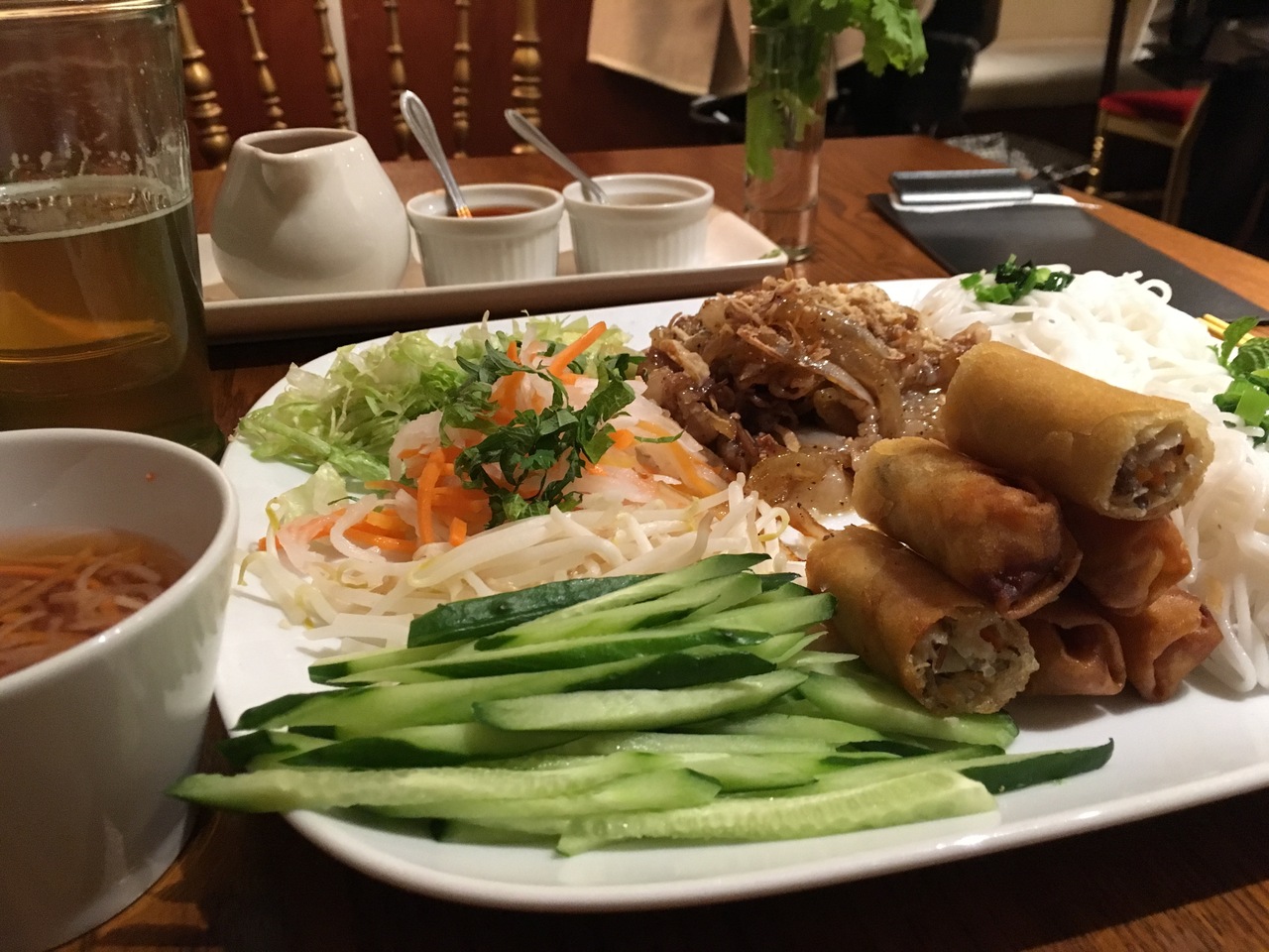 さて、スマホをいじりながらぼんやり待っていると、ブン・チャ・ジョーが出てきたわけだが。しまった、これ、2人分だったり、する?ブン・チャ・ジョーというのは、分かりやすく言うと野菜たっぷり春巻き付きのビーフンのつけ麺(あるいは素麺)。自分はパン皿程度のものにそれらが盛られてきて、つけ汁が付くのだと思ったのだが、皿はどう見てもお盆サイズだし、ビーフンの塊が2つあるし、揚げ春巻きは6個積み上がっている。