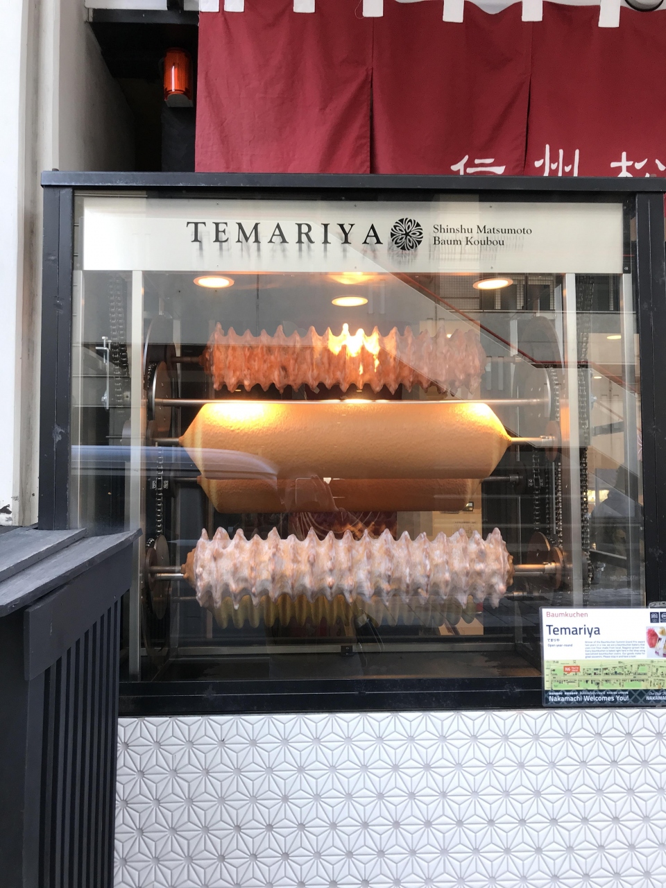 バームクーヘンのお店です。お店の前にはショーウインドー越しに開店するバームクーヘンを見ることができますが、これは飾りでした。店内にはいろんな種類のバームクーヘンがあり、選び放題ですが、米粉で造ったバームクーヘンをすすめられお土産にしました。甘さがスッキリしていてとても評判が良かったです。