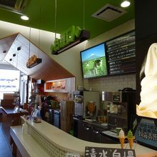 河岸の市 まぐろ館の中にある朝霧高原カフェ。周りは魚料理を出す店だらけ。その中にカフェはちょっと異質です。