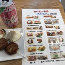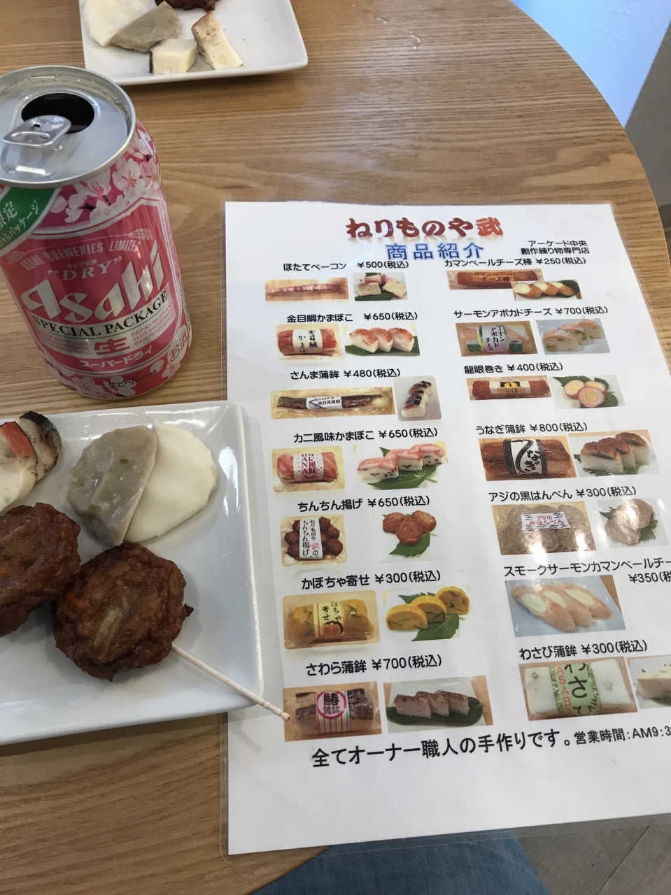 店内で缶ビールセット500円で練り物が試食程度ですが食べられます。