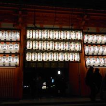 八坂神社の本殿の南にあります。舞の奉納など様々な催しに使われています。祇園祭の時には三基の神輿が安置されます。明かりの灯ったたくさんの提灯が印象的でした。