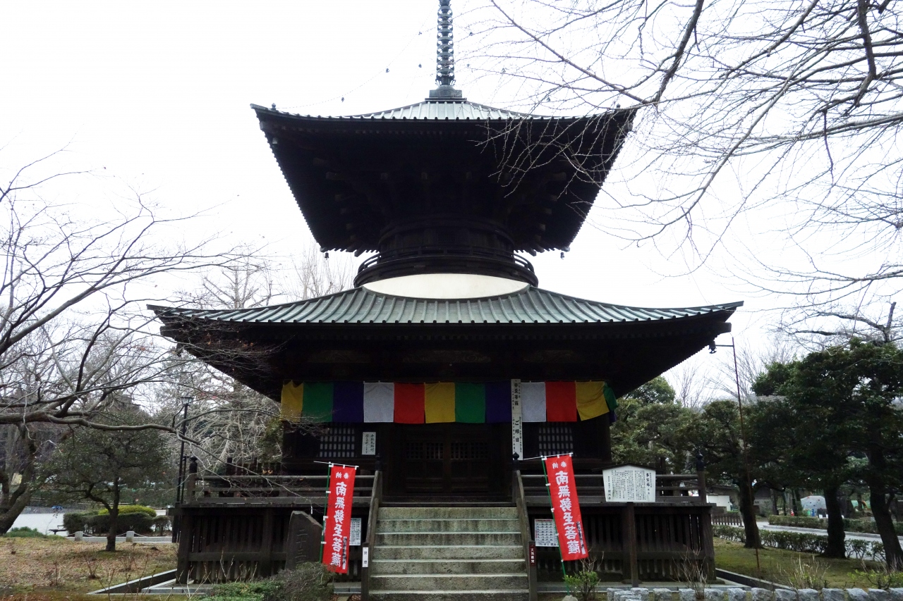 鑁阿寺の境内にある多宝塔です。大銀杏の奥に建っており、円筒形の二階部分と四角い屋根の組み合わせが視覚的に面白い形をしています。5代将軍徳川綱吉の生母、桂昌院尼公によって再建されてから四百年近い歴史があるようです。その間、数回の改修が行われたとのことで、元々の姿はどのようなものだったのでしょうか。