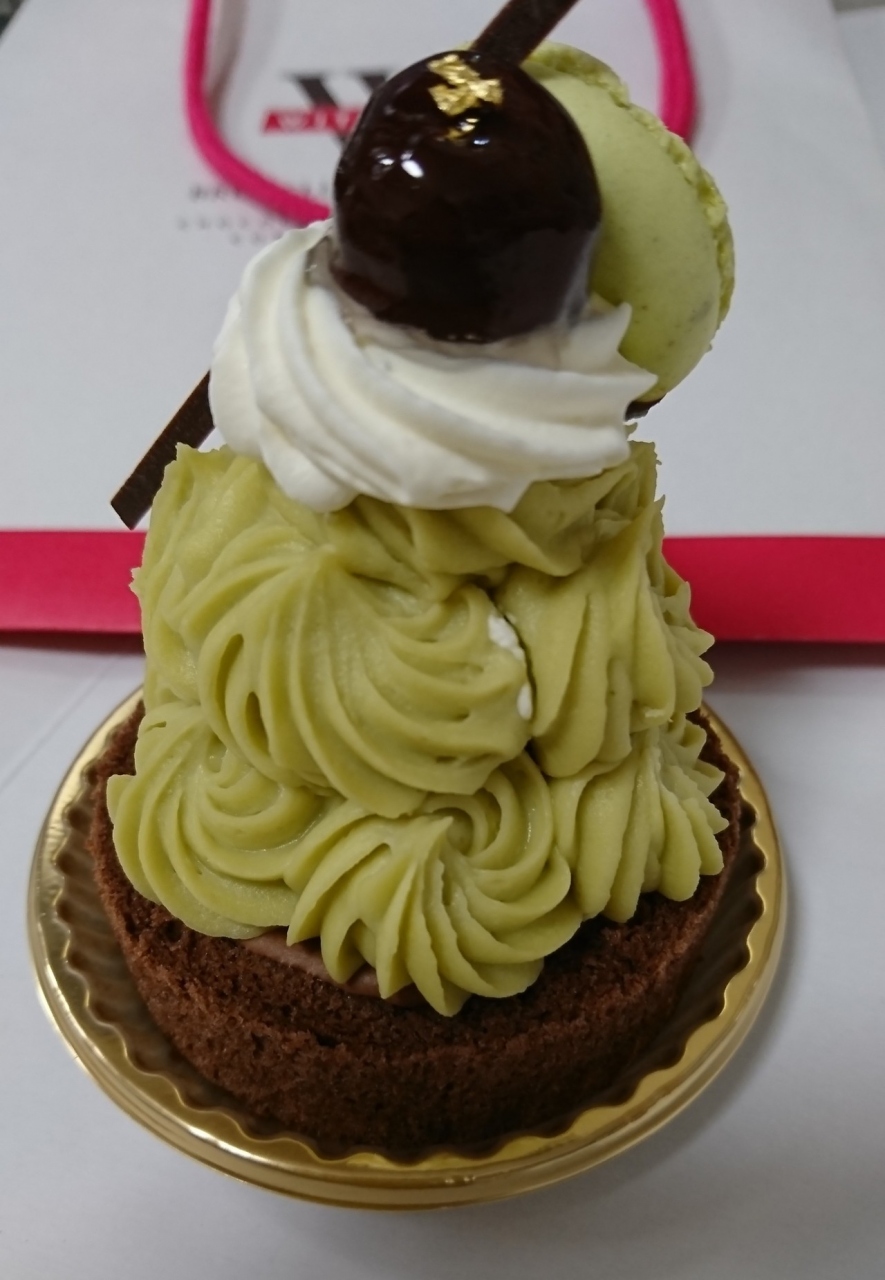 ピスタチオクリームの綺麗な緑色のモンブラン♪ピスタチオの濃厚な深い味わいと香りが引き立つクリームが贅沢に使われており、生クリームとチョコレートの層との味わいも絶妙な癖になる美味しさ。見た目にもゴージャスで、お値段もとても高いですが、たまには日頃のご褒美に!