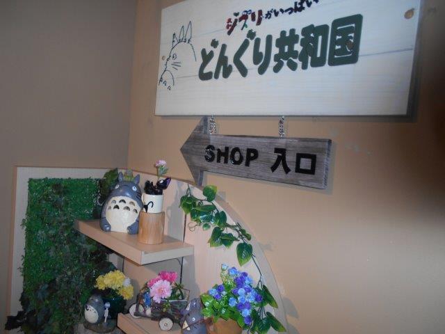 大きなトトロのぬいぐるみがお迎えしています。記念撮影にもぴったりです。お店にはジブリグッズがいっぱいです。外国の観光客にも人気がありそうでした。