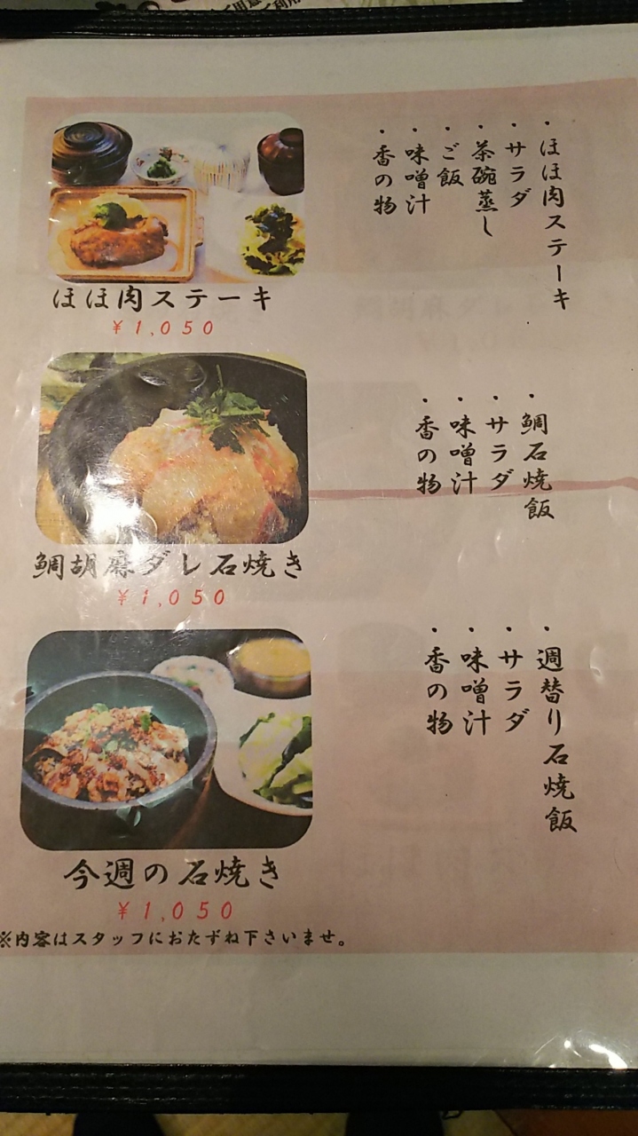 ランチ1050円なり、は三種類。 以前は今日のお刺身定食、焼き魚定食、煮魚定食のような感じで選びがいがあったのですが、固定3種類とは残念です。