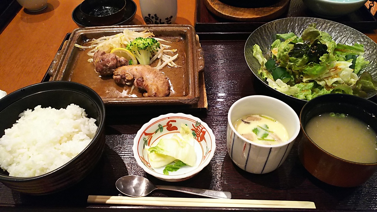 鮪の頬肉 サラダ 茶碗蒸し お新香 味噌汁 白飯のランチ 1050円なり