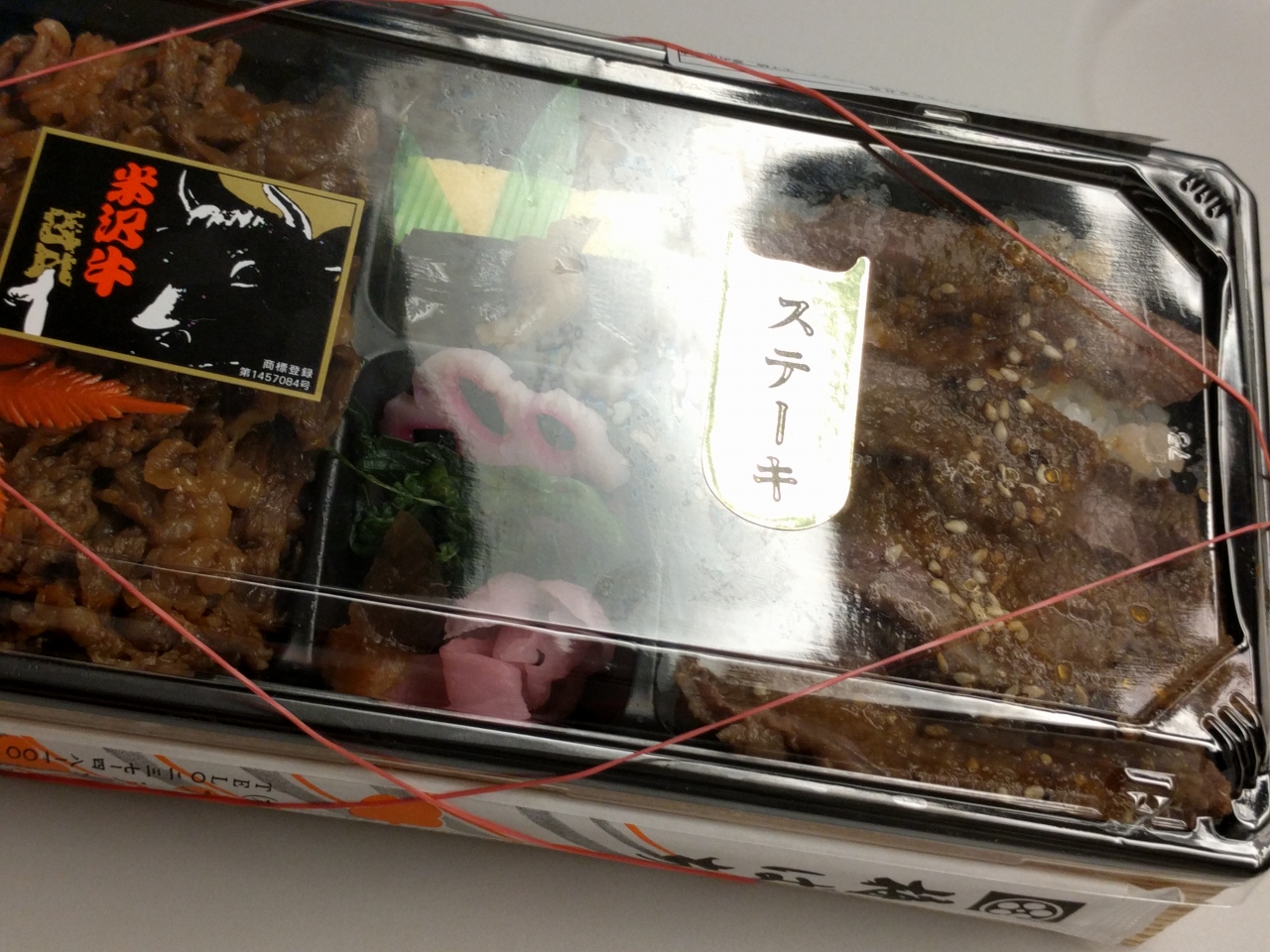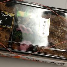 『ステーキすきやき弁当』は、右にステーキ、左がすきやきでした。