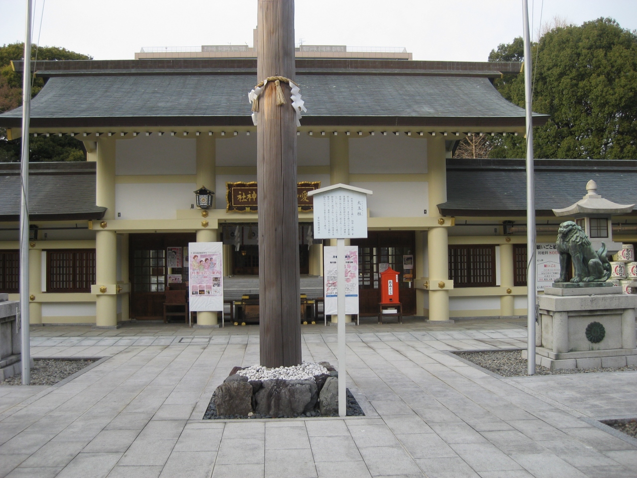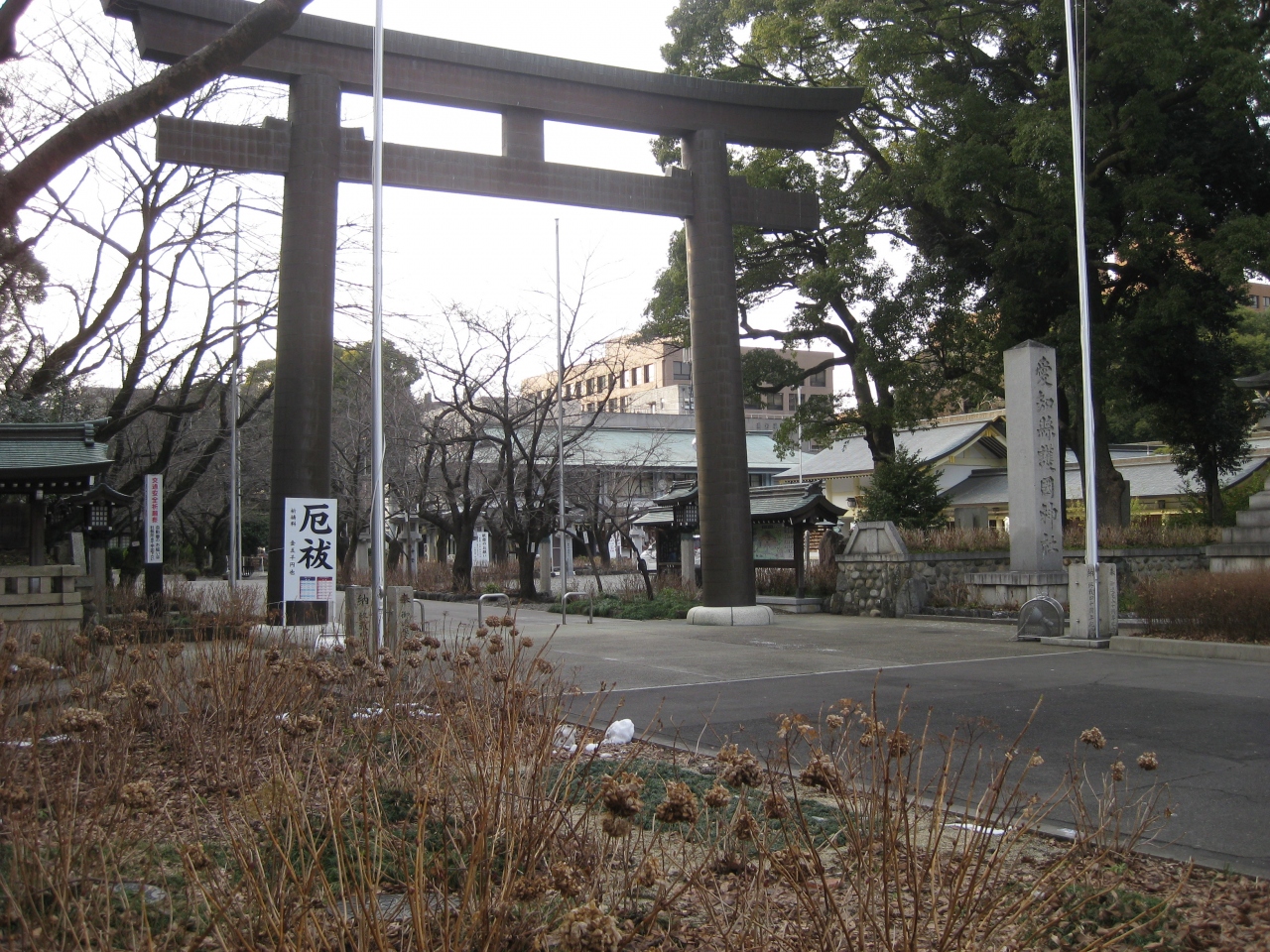 外堀に架かる本町橋から名古屋城郭内に入って直ぐの三の丸に鎮座する神社。戊辰戦争から第二次大戦までの愛知県関係の戦没者9万3千余柱を祀っています。明治元年(1868年)尾張藩主徳川義直が戊辰戦争で戦死した藩士25名の霊を昭和区川名山に祀り祠を建てたのが始まりで、その後社名を変えて現在の社名になったようです。圧倒する様な鳥居と綺麗に清掃された境内、神門前には高さ9.3mを誇る杉の真柱が厳かに建っています。木々に囲まれた静かな雰囲気は見事です。