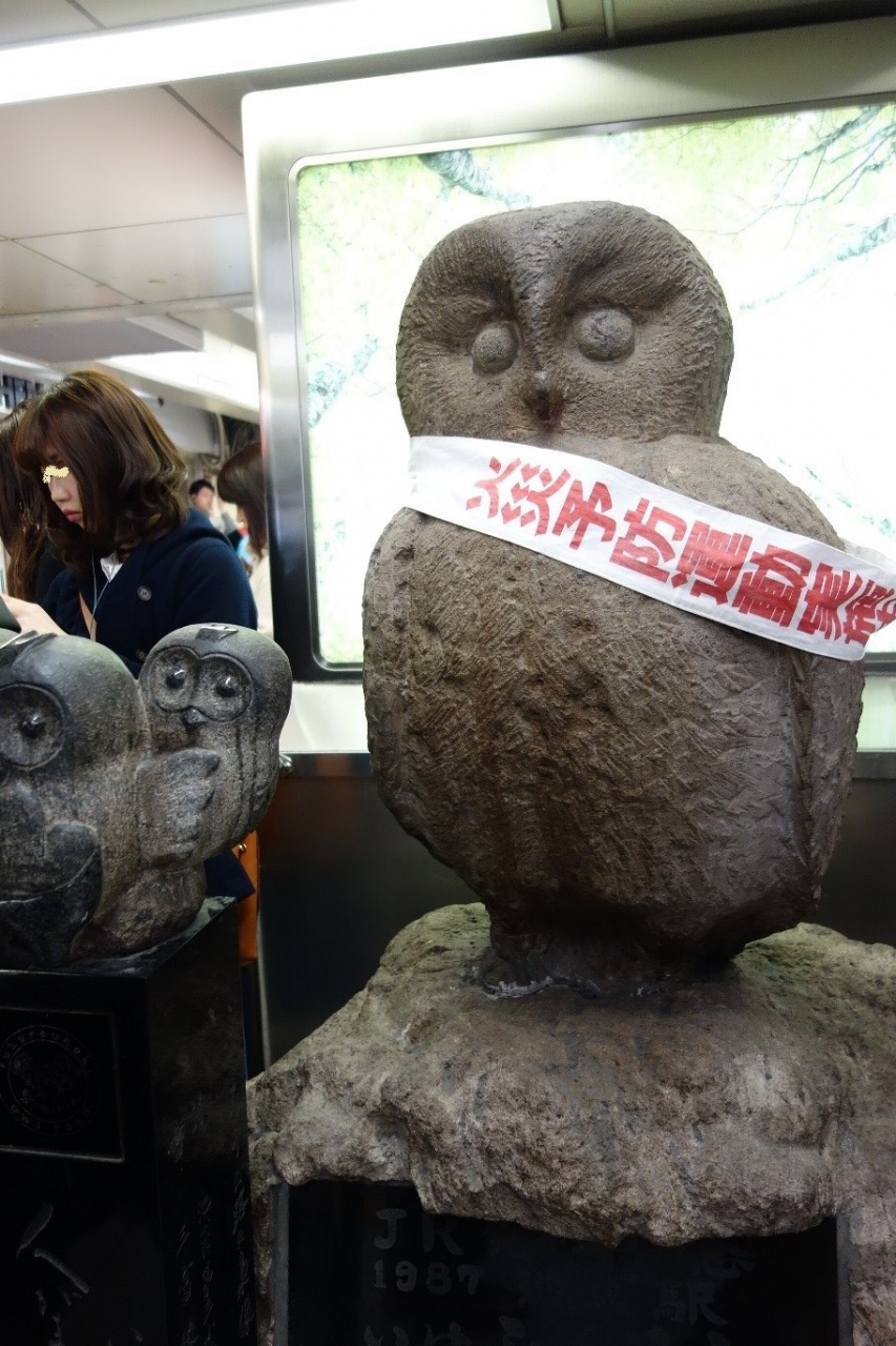 池袋駅にあるふくろうの形をした石像です。待ち合わせ場所として人気でふくろう像の周りにはいつも人がいっぱいです。この日も若者や海外からの観光客さん達でごった返していました。この像の向かい側には地上へ出られる階段もあります。