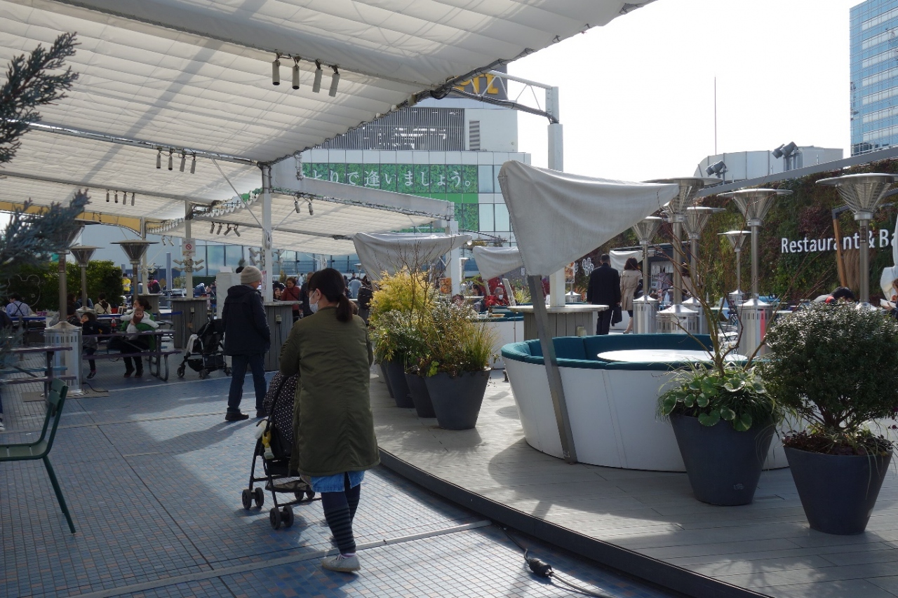 池袋そごうの屋上にある広場です。カフェが有ったりフードコートのような形式で食べ物を売るお店が並んでいて、真ん中にはイスやテーブルが並んでいます。花や緑も有ってなかなかくつろげる雰囲気がありました。ここからお隣のLOFTへも入って行けます。