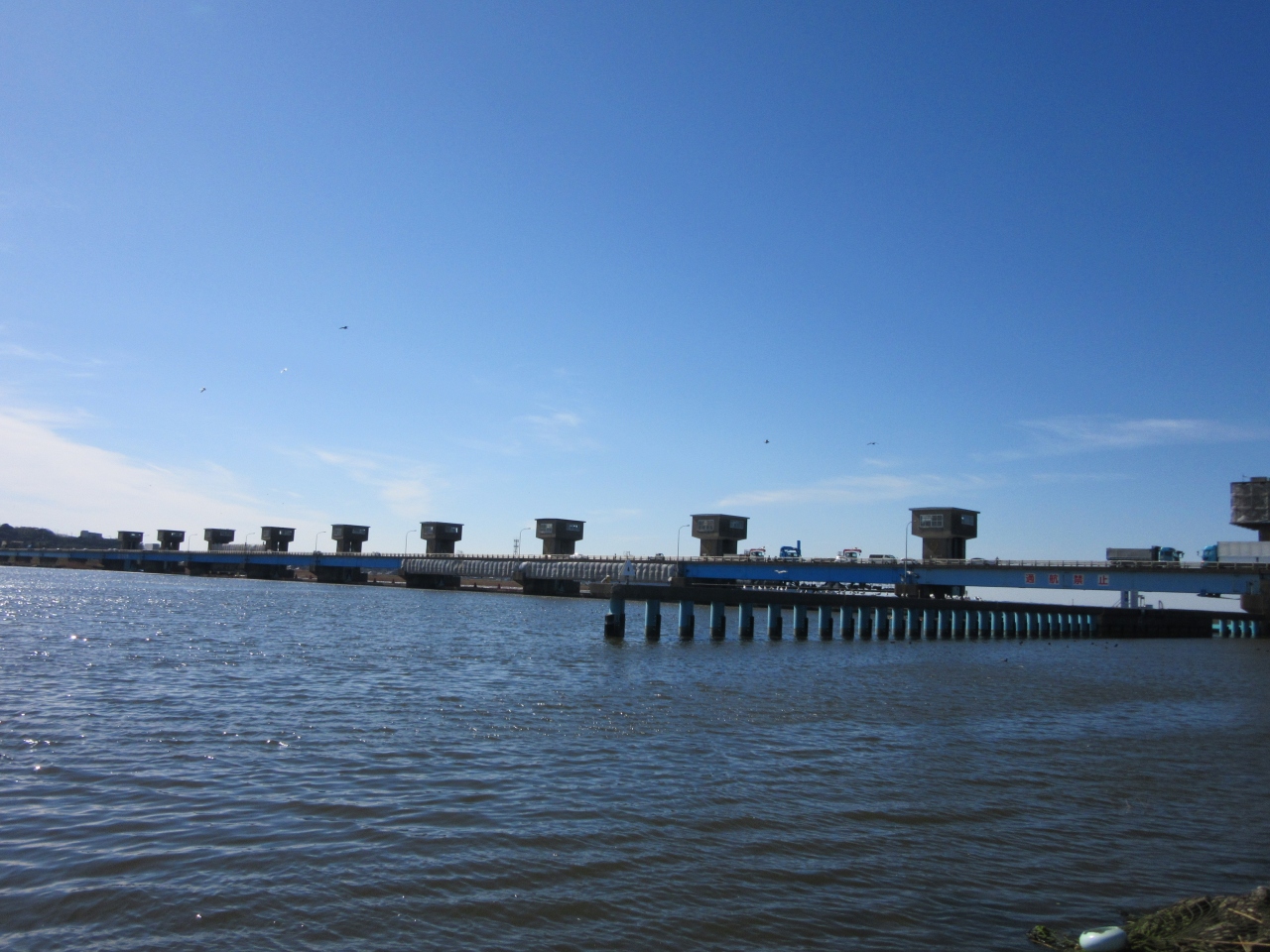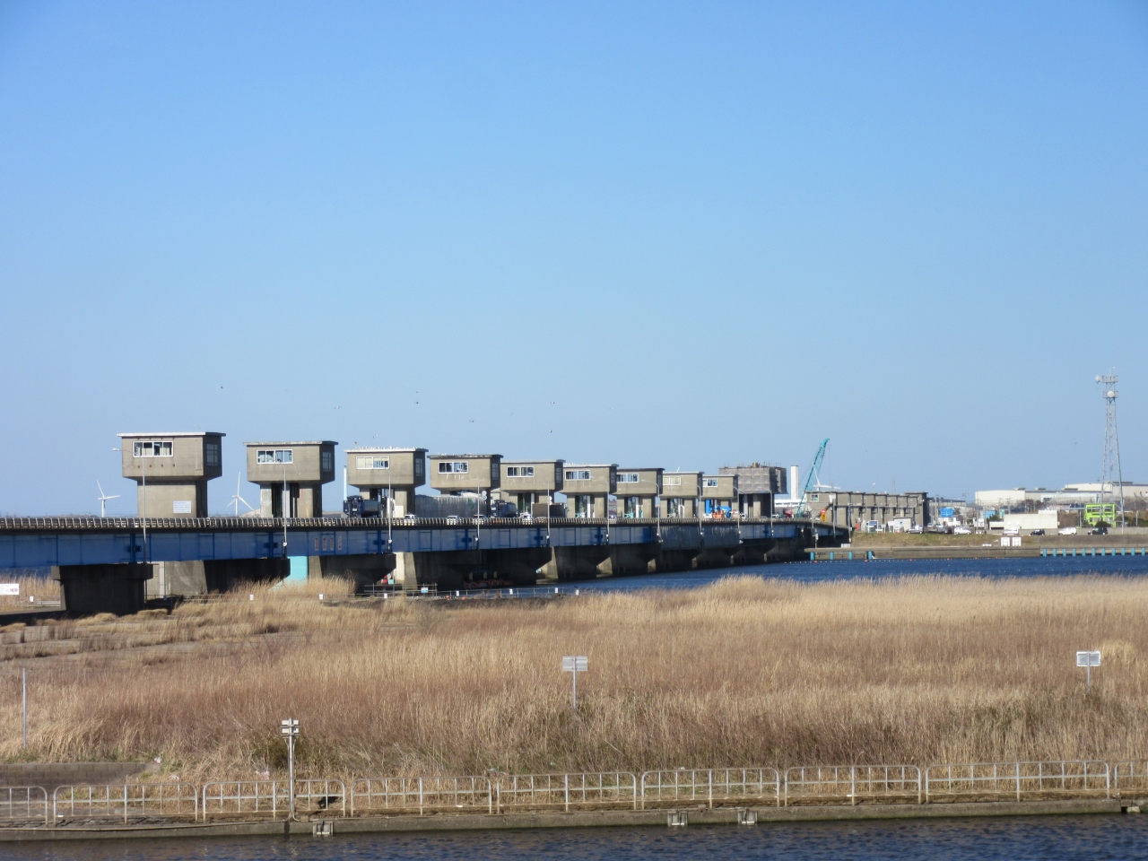 常陸川が利根川に合流する場所にあり分かり難いですが、東側の常陸川にかかる堰は「常陸川水門」と言い、西側の「利根川」に架かるのが「利根川河口堰」です。