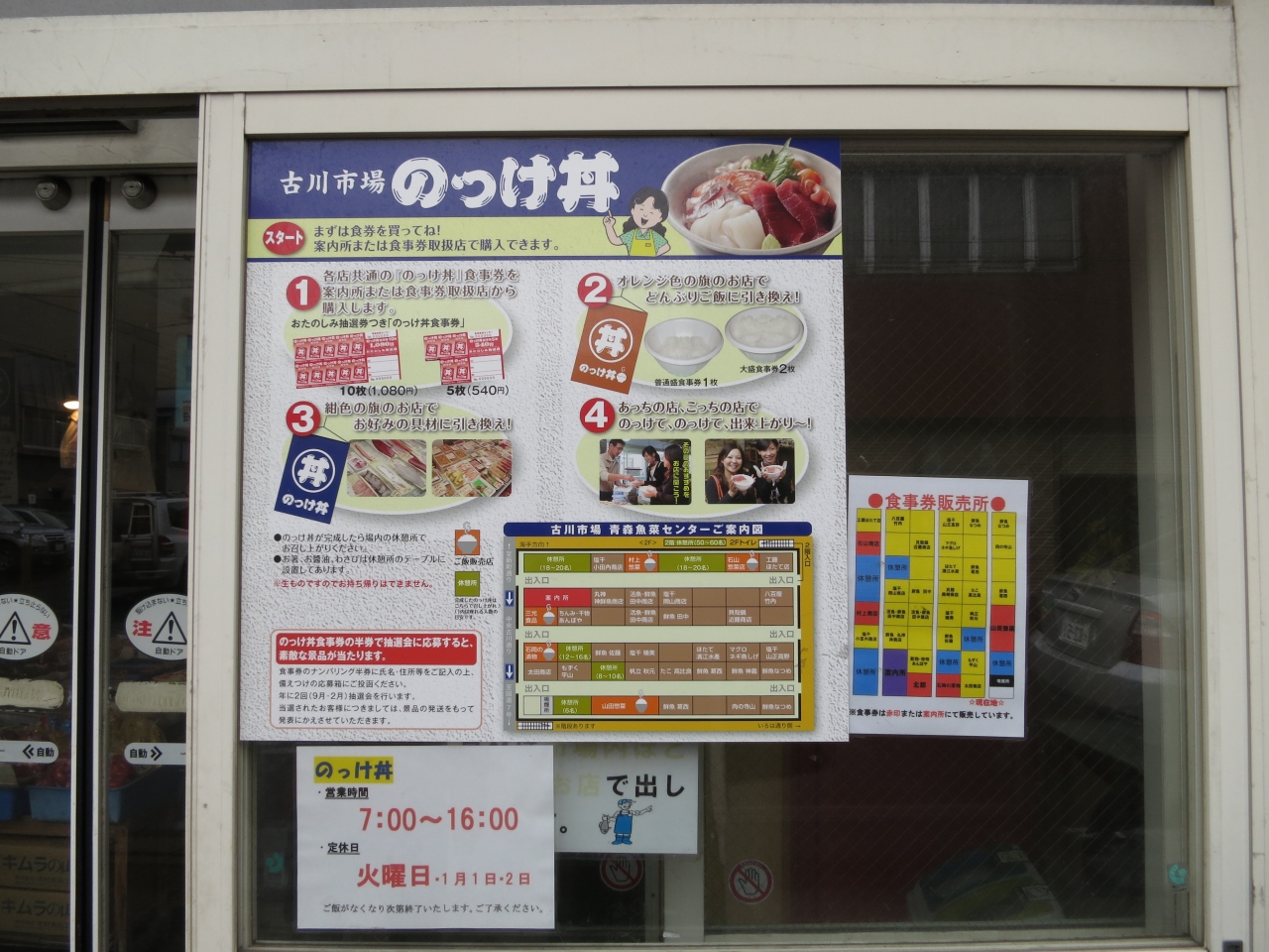 2016年2月21日古川市場ののっけ丼を食べに行ってきました。まず、案内所(店内にあります)食券を購入して好きなお店でチケットと交換して食材を♪