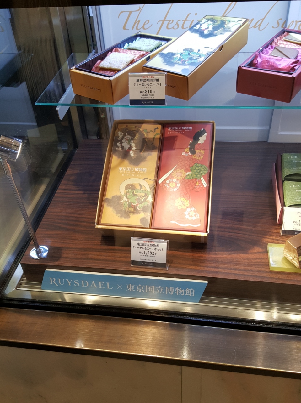 ガラスケースにはちょっと珍しい日本画が描かれたパッケージのパイやクッキーの詰め合わせが。