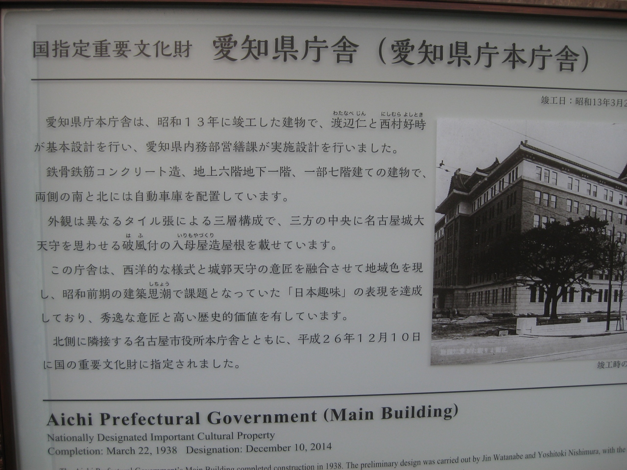 名古屋城三の丸東方、大津通りに面して市役所本庁舎と仲良く並んで立つ県庁本庁舎。昭和13年(1938年)昭和天皇即位の礼の記念事業として建設された由緒ある建物で頂部に名古屋城大天守風の屋根を乗せた帝冠様式が特徴です。瓦屋根を冠した名古屋市役所本庁舎と共に国の重要文化財に指定されています。見ごたえある建物です、是非見学してみて下さい。