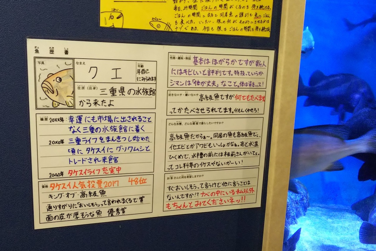 リニューアル直後ということで臨時駐車場も開放されており、館内はすごく混雑していました。けれど、展示をゆっくり見ていてもまったく飽きませんでした。水槽ごとにある手書きの「履歴書」がどれもよかったです。アシカのショーは客席との距離が近く、楽しめました。