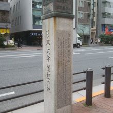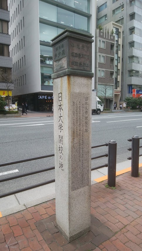 JR・東京メトロの飯田橋駅のすぐ近くにあって、東京区政会館の目の前にこちらの石標がたっています。おとなりに國學院大學、東京府立第四中学校(現在の都立戸山高校)の開学地の石標と並んでいます。日本大学も含めていずれも、皇典講究所をそのルーツとしているもので、日本大学もその前身である日本法律学校がこの地に創設されました。いまでは日本でも有数の規模を誇る大学の発祥がここです。大学が多いこのエリアにはたくさんのこれに類する石碑がありますが、その一つという感じです。
