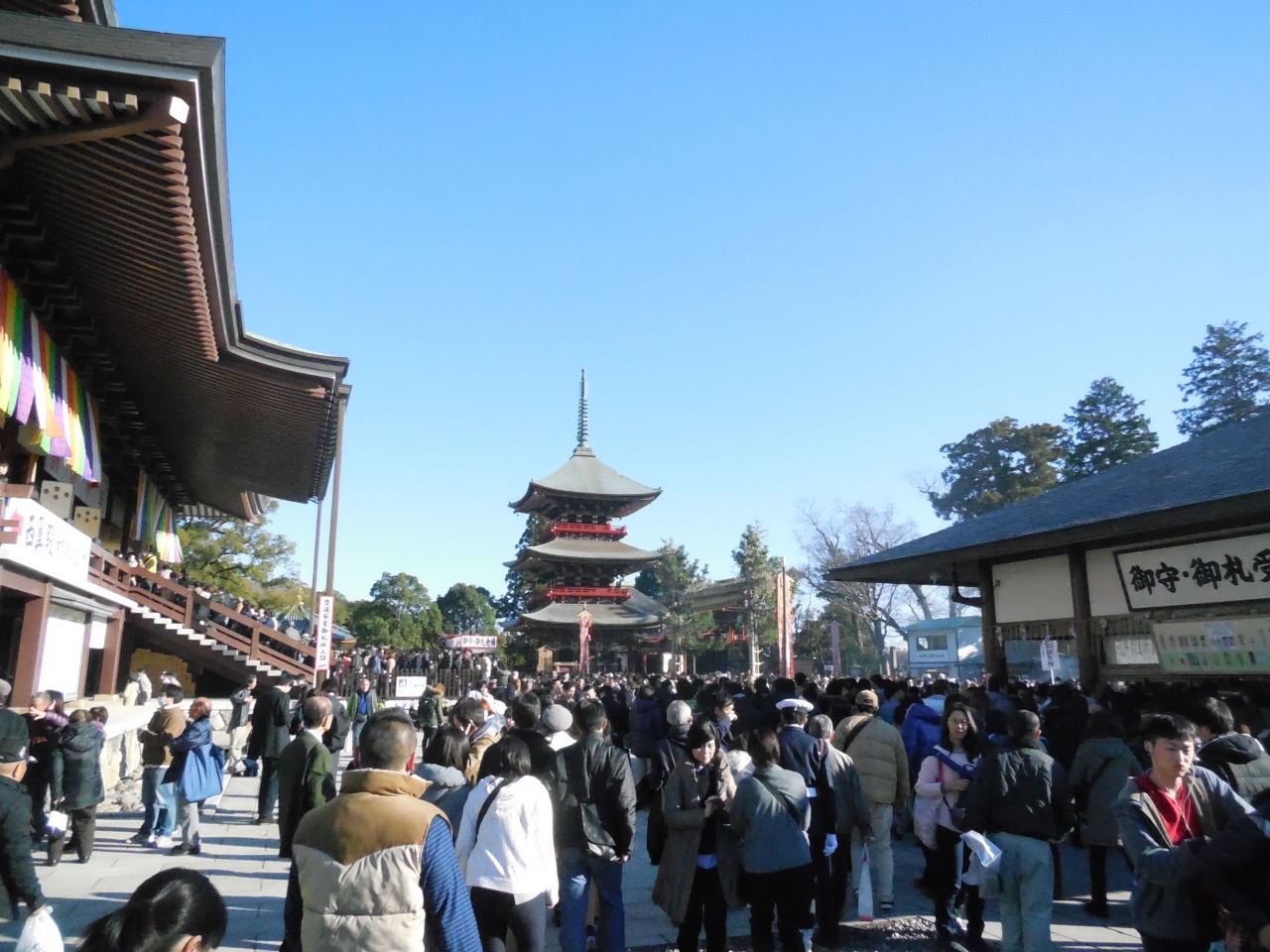 全国で三が日の参拝者が3本指に入るといわれる成田山新勝寺。そのため周囲の道路はまるで機動隊に封鎖されたように大混雑、また電車での参拝も車内が混雑しますし、駅からの表参道も参拝者ですごくごった返します。本堂への参拝も元旦などは500メートルを超えるような長蛇の列が出来るため、参拝後はぐったりすること間違いないです。