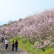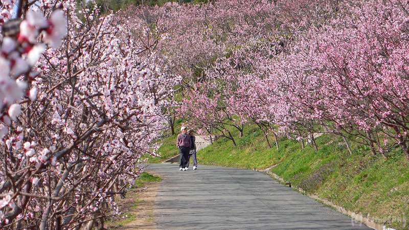 斜面に沢山の杏の樹が植わっている。