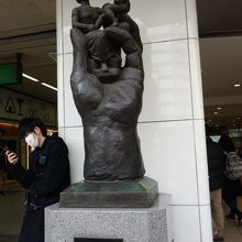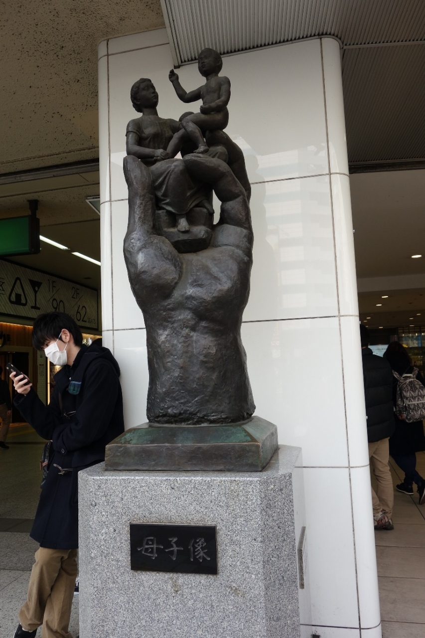 池袋駅の待ち合わせ場所の定番として有名ないけふくろうの石像ですが、その近くにもう一つの像があります。いけふくろうのちかくにある階段を上がって地上に出るとすぐに母子像を見る事が出来ます。大きな掌に母子が乗ったデザインです。