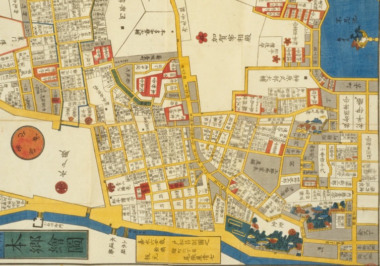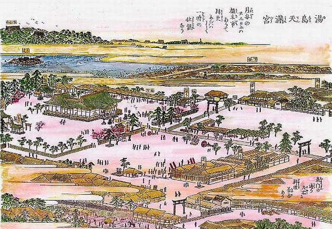 江戸の絵図によると、江戸時代の湯島天満宮の表門の表鳥居の南側には、参道沿いに門前町ができ、建物が並んでいたようです。