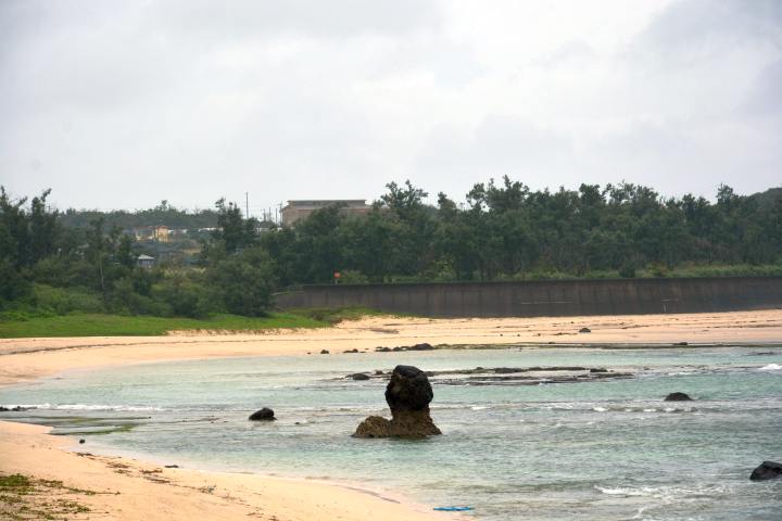 砂浜は広く、海に向かって右の方に行ってみると、岩礁エリアがあって、アオコだらけでしたが潮が引くと潮だまりができていました。