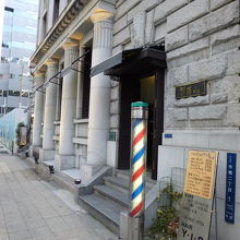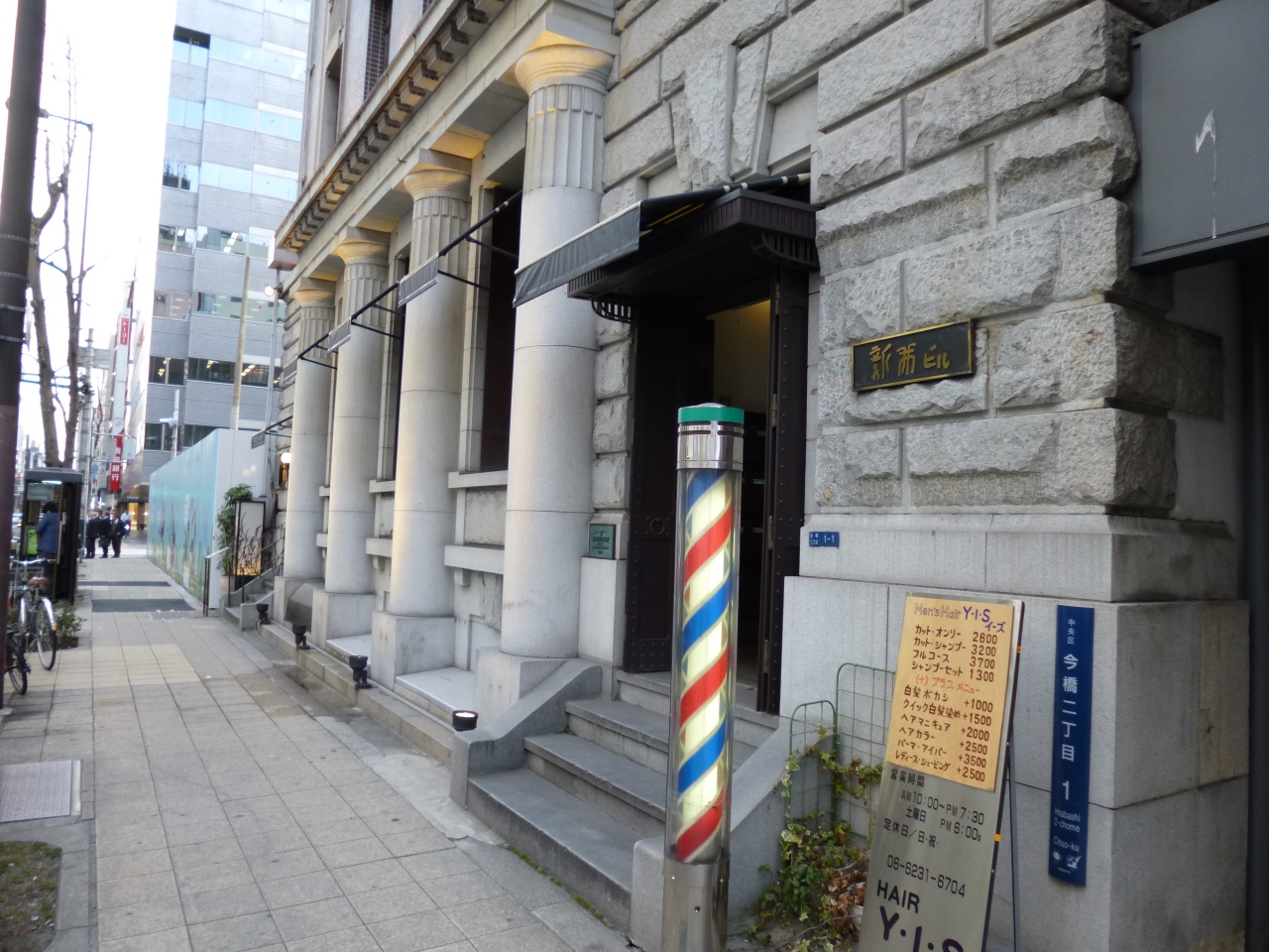 堺筋沿いにある歴史あるビルのひとつが「新井ビル」です。ビルの正面には4本の円柱を配し、その横に床屋さんの「サインポール」があり、遠くからも目立ちます。