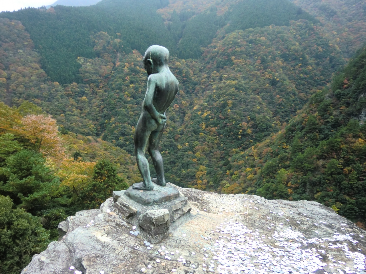 V字型の深い渓谷の上にある岩で、小便小僧の像が建っています。