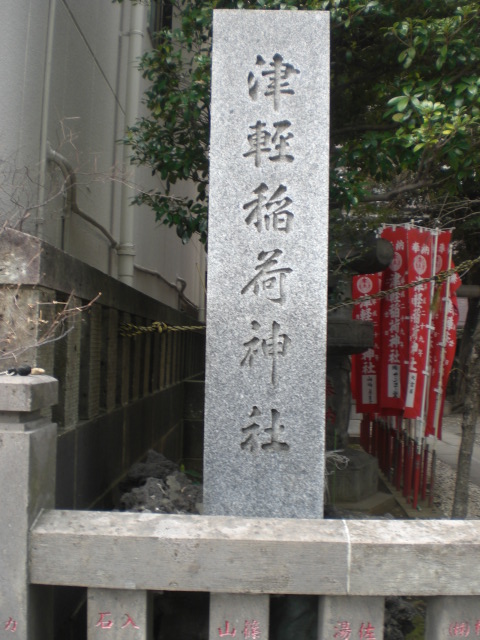 北斎通りの歩道のすぐ傍に、津軽稲荷神社の標識石柱が立てられていて、判り易くなっています。