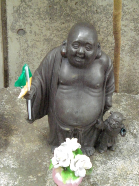 太鼓橋の手前には、布袋様の銅像が置かれていて、小さくてかわいい点から、親しみが湧いてきます。