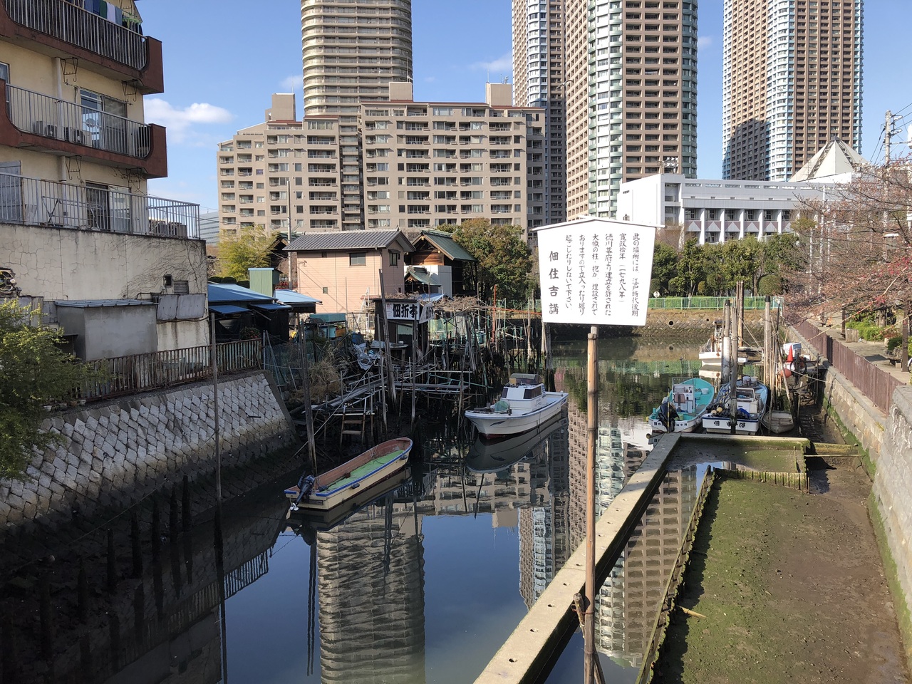 佃島や、石川島などの都心に近い高層マンション群の谷間に掘割があり、昔昔佃島の渡しがあったという碑があります。