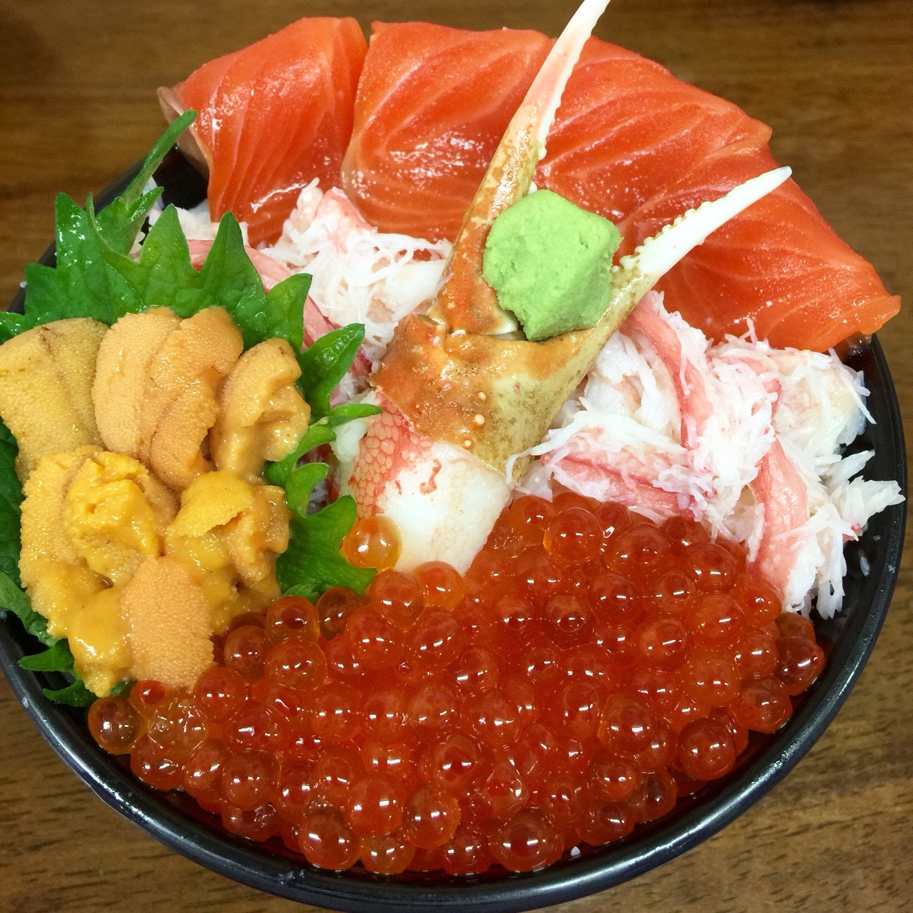 三角市場にはお食事処はたくさんありますが、活気のあるこちらのお店にしました。注文したのはANAと共同開発と書いてあった、ANA特製丼2000円。いくら、ウニ、蟹、サーモンと食べたいものが全て入っており、美味しかったです。