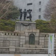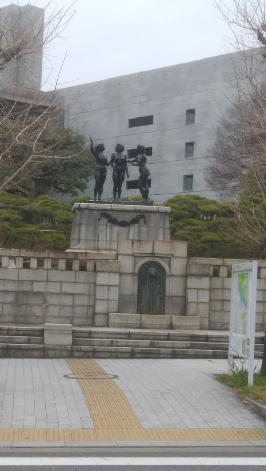 内堀通り(国道20号線)の三宅坂の交差点の脇にあって、最高裁判所の隣接した場所にあるのですぐにわかります。三宅坂小公園にあります。石造りのかなりスケールの大きな台座に設置されており、その上に立つ三体の女性の像は芸術性の高い銅像だと思います。昭和25年に設置されたもので、広告が平和産業、産業文化の発展に寄与したことを記念して建てられたものです。三宅坂交差点のすごく目立つ場所で交通量が多い場所なので少し賑やかな場所ですが、この界隈を散策するときに立ち寄りたいスポットです。