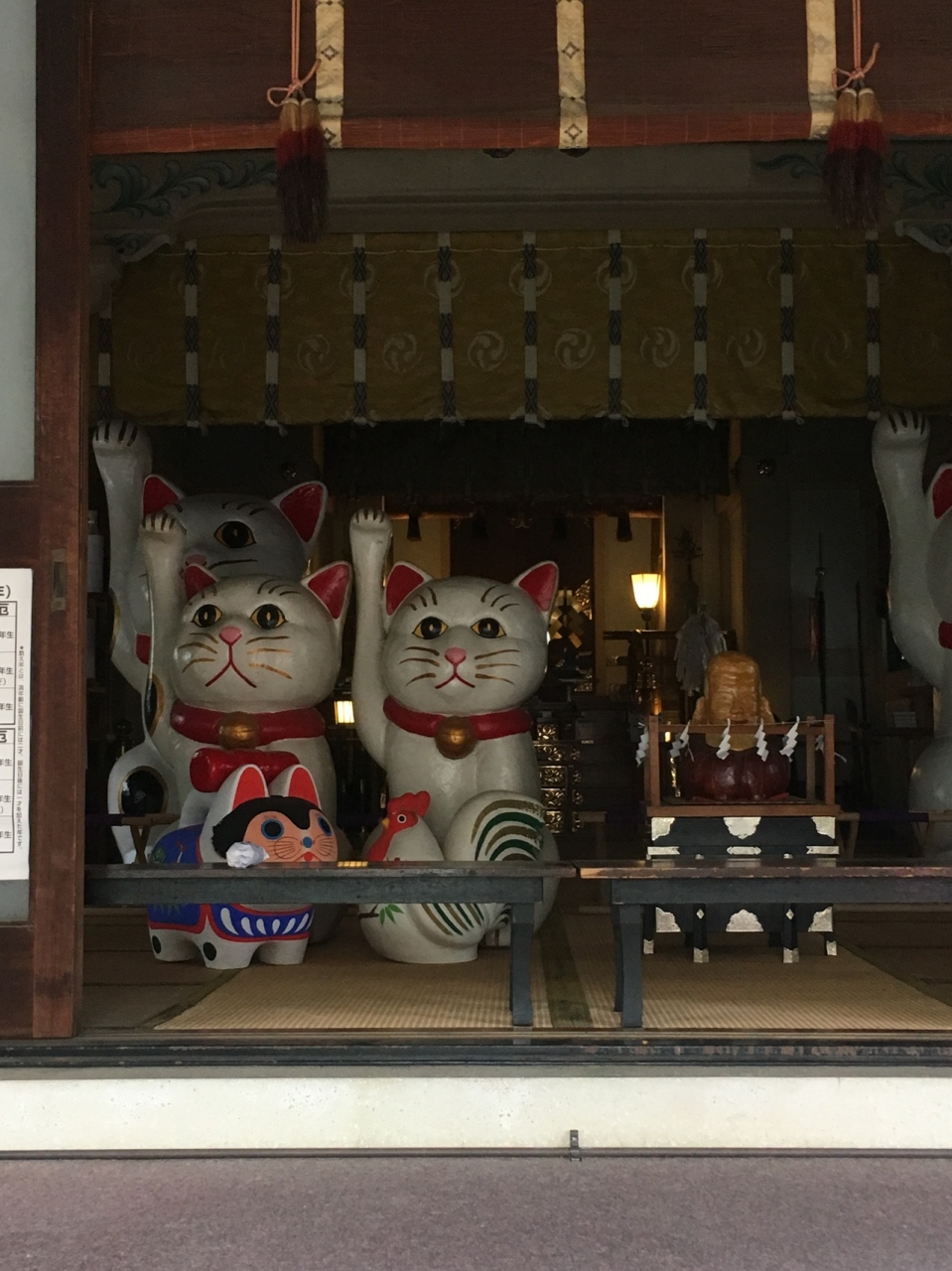 浅草寺から5分くらい歩くでしょうか。浅草寺の裏手、隅田川沿いに今戸神社はあります。入ってみるとけっこう殺風景。境内に招き猫が二体。お参りして、招き猫おみくじを引きます。お守り?つき。そういえば招き猫発祥のいわれは何なんでしょうか?神社の方に聞いてみればよかった。