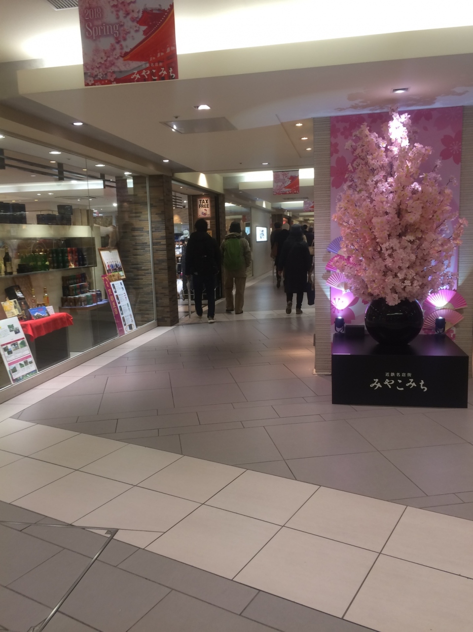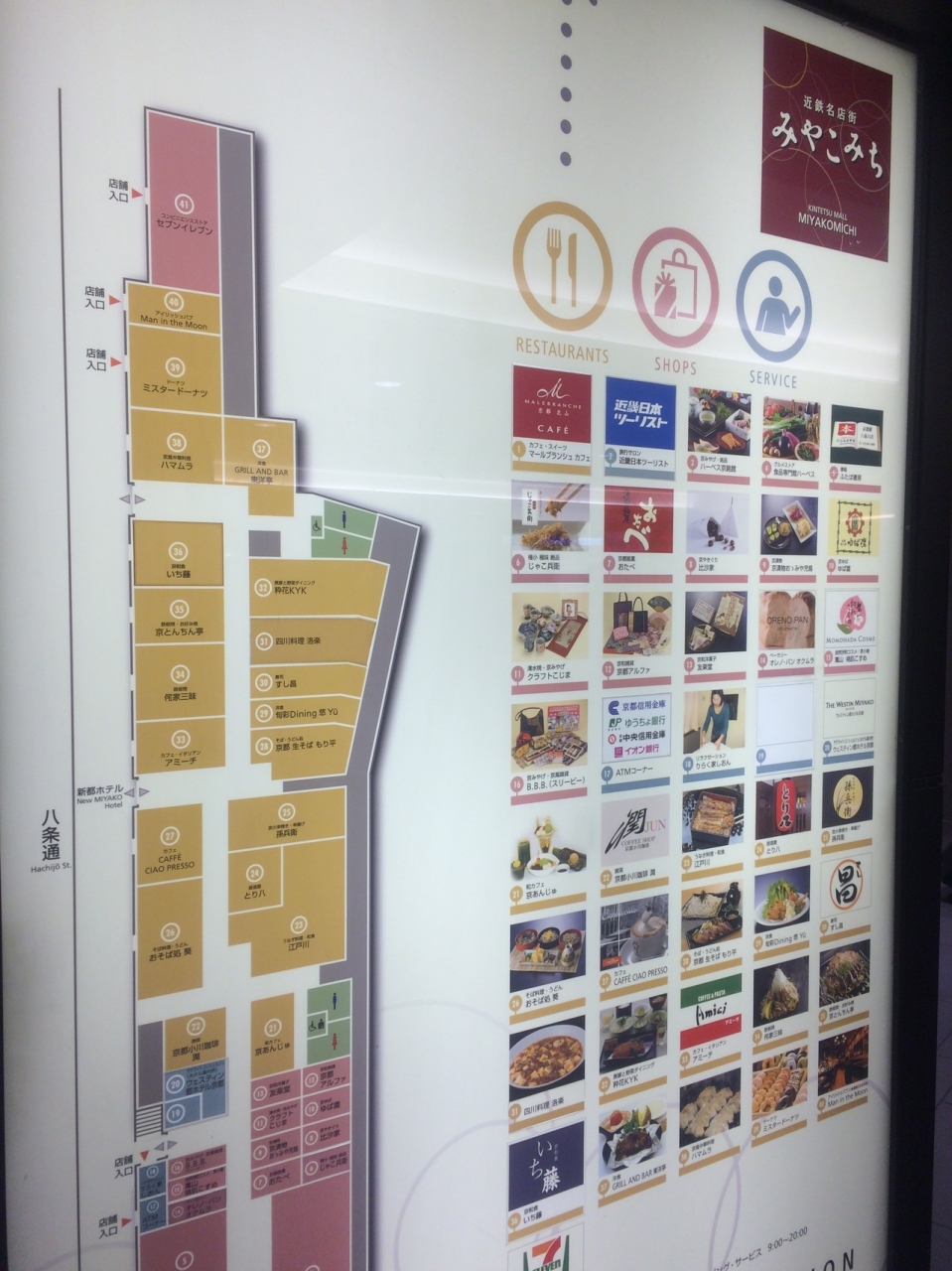 出入口の外枠が黒っぽくなっていて和風情緒ぽい感じでした。京都駅内の1階なので人が多く、どの店も混み合っていました。食べのもの屋は、和洋折衷なんでも揃っていて、コンビニもありました。人工の滝が流れているところが気分が落ち着きました。