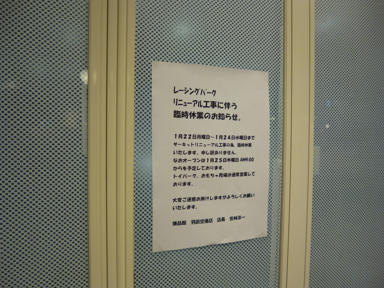 羽田空港国際線ターミナルビルの商業施設の中で、一番楽しいのが「博品館TOY PARK」です。こちらの店舗の規模はかなり大きく、広いレーシングパークもあるのですが、訪問した時は残念ながらリニューアルで休業していました。